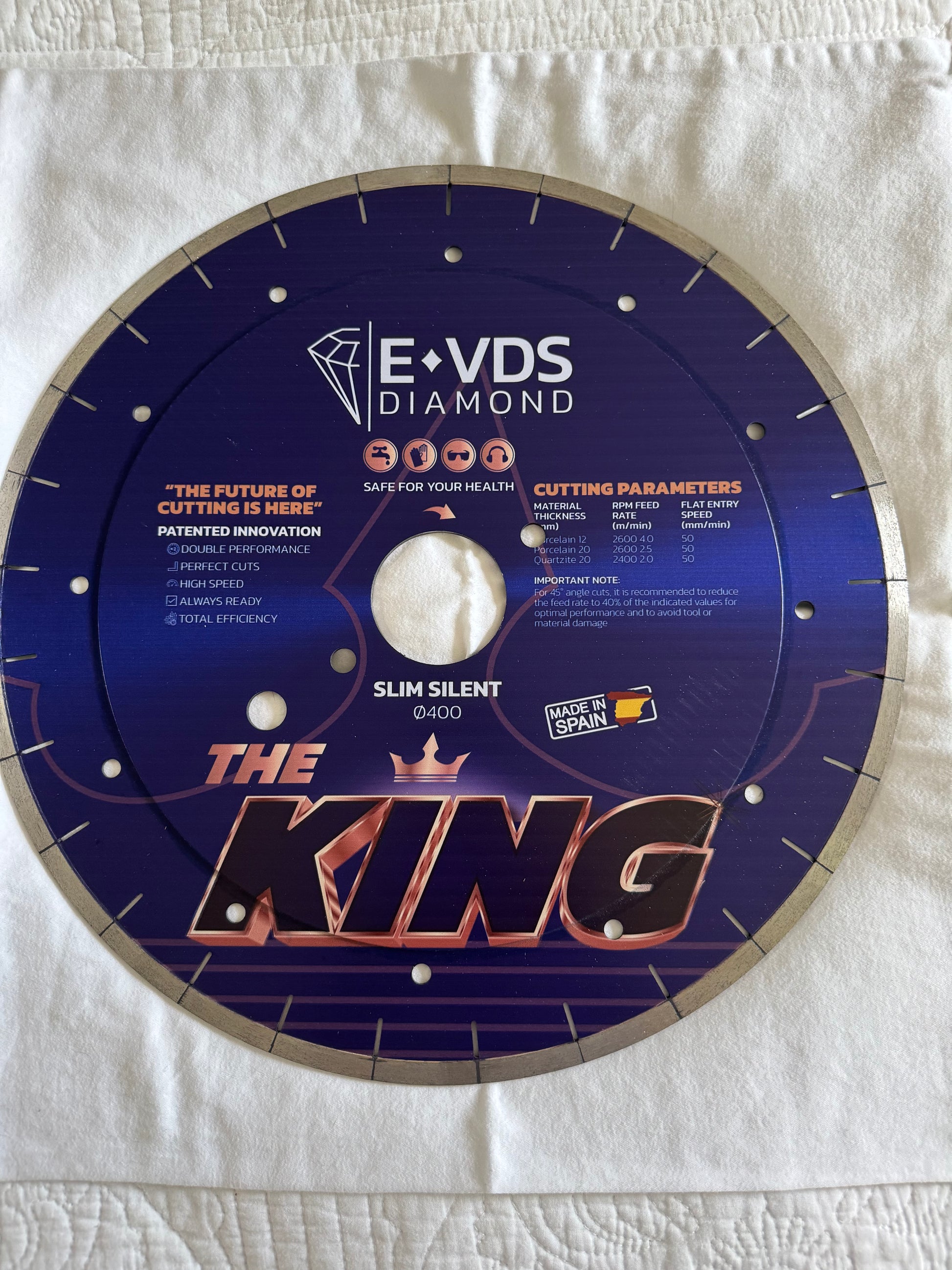 Expertly designed and crafted, the 16” E-VDS “The KING” UCS Blade sets the standard for speed and precision. Its patented technology eliminates the need to dress the blade, ensuring uncompromised quality of cut. Experience the fastest UCS blade on the market and elevate your cutting game.